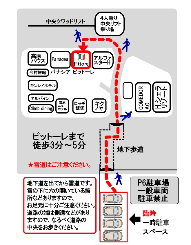 P6駐車場トンネル入り口横の一時駐車スペースより徒歩でお願いいたします。なおお店まで雪道となりますためスノーブーツ長靴をご用意いただき暖かくしてご来店下さい。凍結により滑りやすくなっていますので十分ご注意ください。道路の端は危険なためなるべく真ん中を歩くようにしてください。