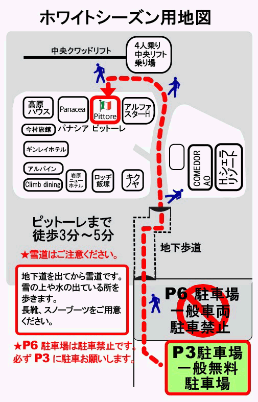 ピットーレ岩原本店 本日は、お車はP3駐車場にお願いいたします。 12/14 本日は、お車はP3駐車場にお願いいたします。 お店まで雪道となりますためスノーブーツ長靴をご用意いただき暖かくしてご来店下さい。凍結により滑りやすくなっていますので十分ご注意ください。道路の端は危険なためなるべく真ん中を歩くようにしてください。